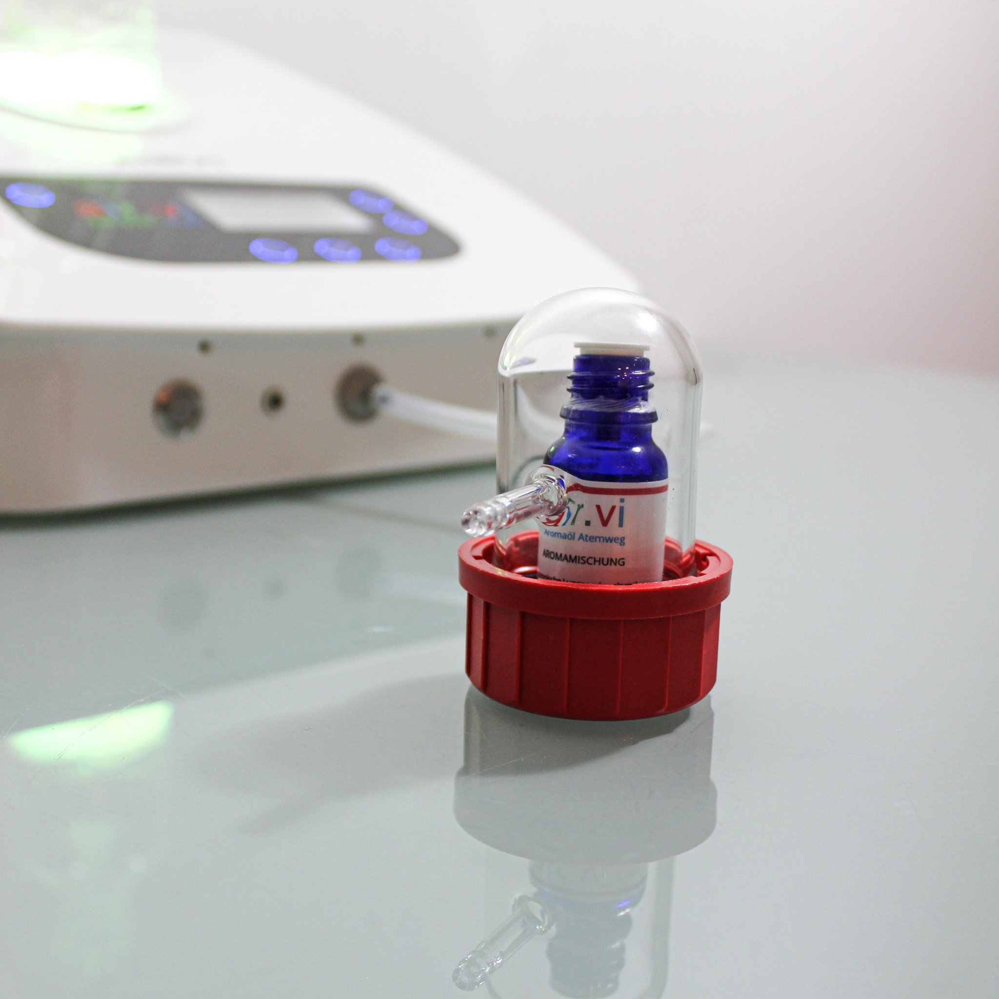 Im Lieferumfang Ihres air.vi health IQ 5 Therapiegerätes ist ein Aromakolben, inkl. einer Aromaflasche, deren Inhalt speziell für Atemwegerkrankungen geeignet ist, enthalten.